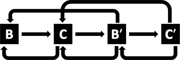 Однако по поводу эмоций являющихся следствием мыслей о каком-либо событии у людей нередко возникают вторичные мысли приводящие к вторичным эмоциям В этом случае вторичным событием выступает изначальная эмоция Например, тревога возникшая из-за катастрофических мыслей во время полёта на самолёте может трактоваться человеком как признак сумасшествия что приведёт к вторичной эмоции стыда или усилению изначальной тревоги В этом примере вторичным событием является изначальная эмоция тревоги Естественно, что вторичные мысли приводящие к вторичным эмоциям могут возникать не только по поводу эмоциональных, но и по поводу телесных и поведенческих реакций Например, учащённое сердцебиение являющееся телесным проявлением тревоги,может интерпретироваться человеком как предвестник сердечного приступа что приведёт к усилению тревоги и вызову бригады скорой помощи Или, скажем, повышение голоса на родную сестру выступающее поведенческим следствием гнева, может осмысливаться человеком как недопустимое и аморальное что вызовет чувство вины, которое повлечёт за собой извинения перед сестрой (см рис. 4). (С), (В) (А), (В′), (С′). (А′), (С). (С), (В) (А), (В′), (С′). (А′) (С). (В′), (С′), (С=А′). (С=А′), (B′), (С′). (С=А′), (B′), (С′)