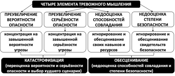 В самом тревожном мышлении также можно выделить четыре главных элемента, которые и обуславливают возникновение тревоги – преувеличение вероятности опасности, преувеличение серьёзности опасности, недооценка способностей совладания и недооценка степени безопасности. Разберём эти элементы более подробно: