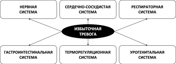 Важно понимать, что симптомы, вызванные избыточной тревогой, какими бы неприятными они не были, являются не признаком реального органического заболевания, а следствием искажённого мышления, которое создаёт тревогу, не могущую проявляться иначе как в виде телесных симптомов. А симптоматики, порождаемой избыточным уровнем тревоги, может быть превеликое множество, ведь тревога заставляет активно работать разные органы и системы человеческого организма (см. рис. 5).
