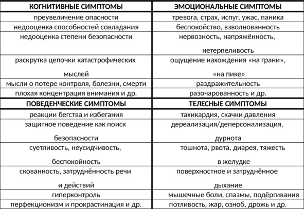 Основные симптомы тревоги, сгруппированные по принципу их принадлежности к когнитивной, эмоциональной, телесной и поведенческой сферам, в наглядном и доступном виде представлены в нижеприведённой таблице (см. таб. 1).