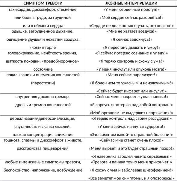 Как мы замечали ранее, панические атаки случаются из-за искажённой катастрофической интерпретации физиологических симптомов тревоги. Ниже мы приводим примеры таких ложных трактовок (см. таб. 1).