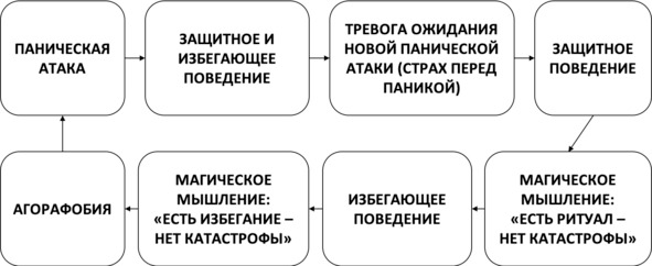 Со временем у людей с паническими атаками может развиться паническое расстройство с агорафобией, которое представляет собой боязнь столкновения с местами и ситуациями, ассоциирующимися с возможностью панического приступа, иными словами, страх находиться в открытых (или закрытых) пространствах или общественных и многолюдных местах. Люди с агорафобией неосознанно воспринимают такие места и ситуации как источники своих дискомфортных симптомов и панических атак. К тому же из-за механизма сверхобобщения страх перед конкретной ситуацией, в которой у человека случилась паническая атака, может распространиться и на аналогичные места и ситуации. Скажем, если паника накрыла вас в автобусе, вы со временем можете начать бояться и избегать передвижений на любых видах транспорта. В этом отношении человек, страдающий паническими атаками, склонен избегать пугающих его стимулов или использовать защитное поведение для предотвращения панической атаки и облегчения своего состояния в момент нахождения в тревожащей ситуации. Он верит в то, что если не будет использовать защитное и избегающее поведение, то с ним случится какая-то физиологическая или психическая катастрофа, однако до тех пор, пока человек прибегает к таким стратегиям, любая ситуация будет казаться ему опасной. Порочный круг панического расстройства с агорафобией в наглядном и схематичном виде представлен ниже (см. рис. 2).