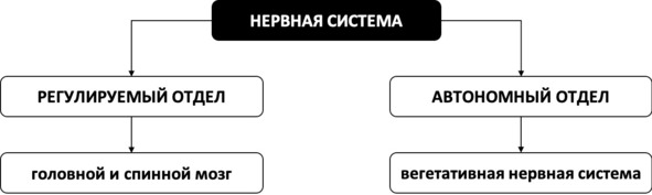 Чтобы вступить на путь постепенного преодоления разных проявлений стресса, важно понимать физиологические законы их функционирования. Любые техники и упражнения представляют собой лишь следствие этого понимания и, укрепляя теоретический фундамент, позволяют кирпичик за кирпичиком выстраивать здание счастливой жизни без избыточных стрессовых переживаний. Для начала нам нужно вспомнить о том, что у каждого из нас есть такая прекрасная вещь, как нервная система. «Ну ничего себе прекрасная!» – сразу же воскликнут некоторые читатели. – «У кого-то, может быть, и прекрасная, но моя нервная система давно порвалась на тряпки!» Не торопитесь вешать свою нервную систему на гвоздь или задвигать на антресоли. Она вам ещё пригодится. Но чтобы всякий раз, образно говоря, не рвать её на британский флаг, необходимо понимать, как она всё-таки устроена. Итак, наша всё ещё прекрасная нервная система состоит из двух отделов – регулируемого (он включает в себя головной и спинной мозг и позволяет человеку свободно совершать контролируемые действия) и автономного (этот отдел самостоятельно регулирует работу внутренних органов и секреций и не зависит от желаний человека) (см. рис. 1).
