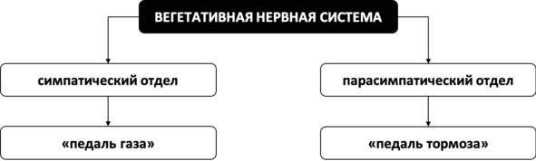 Однако нас будет больше интересовать автономный отдел нервной системы – вегетативная нервная система. Почему? А потому что мало того, что вегетативная нервная система – женщина сильная и независимая, потому как функционирует самостоятельно и не зависит от наших желаний, так она ещё и «вся такая противоречивая», поскольку состоит из двух отделов – симпатического и парасимпатического, выполняющих диаметрально противоположные функции. Если симпатический отдел отвечает за мобилизацию организма при реальной или даже представляемой в мыслях угрозе, то парасимпатический отдел расслабляет организм при отсутствии каких-либо угрожающих событий или мыслей о потенциальной опасности. При этом неважно, угрожает ли вам реальная опасность или вы просто нарисовали в своём творческом воображении катастрофическую картину, как самолёт, на котором вы завтра полетите, упадёт на поезд, в котором по роковому стечению обстоятельств будет ехать ваш друг. В любом случае начнёт усиленно работать симпатический отдел, который мобилизует ваш организм для бегства, сражения или замирания с целью выживания, чтобы вы были готовы действовать по тысячелетиями вырабатывавшемуся эволюцией механизму. Поэтому заслуженную порцию адреналина и кортизола вы точно получите. Конечно, вы будете испытывать и телесные симптомы. Изволите тревожиться сами – извольте и тело побеспокоить. Но когда реальная или представляемая опасность сойдут на нет, в дело вступит парасимпатический отдел, и вы начнёте отдыхать. Итак, вегетативная нервная система без вашего участия подстраивает работу организма под различные стрессовые события. И это существенно экономит время, ведь вряд ли вы говорите: «Сердце, бейся быстрее!» или «Кишечник, давай-ка поработаем в усиленном режиме! Хорош уже халтурить!» Для наглядности отделы вегетативной нервной системы можно условно обозначить как педали газа и тормоза, отвечающие, соответственно, за реакции стресса и релаксации (см. рис. 2).