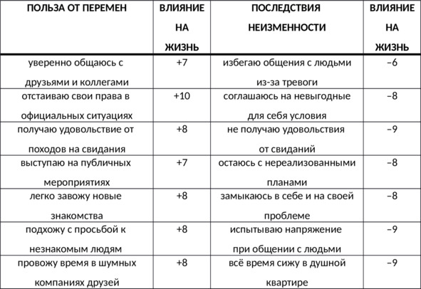 Помимо формулирования цели вам также важно составить таблицу мотивации, в которой вы пропишете конкретные элементы, из которых состоит ваша общая цель. Иными словами, в таблицу мотивации заносятся все предстоящие жизненные перемены, которые оцениваются от 0 до +10 по степени их значимости для вас, а также последствия неизменности, которые оцениваются аналогично, но зеркально: от 0 до —10. Итак, левая часть таблицы будет содержать пользу от перемен, то есть описание того, как вы будете жить после преодоления стресса (изменения важно описывать в прошедшем времени, как будто то, о чём вы пишете, уже осуществилось, словно вы уже так живёте). Правая часть таблицы будет содержать последствия неизменности – описание того, что будет происходить, если вы продолжите оставаться в своей эмоциональной проблеме (см. таб. 1). Такое оценивание послужит вам напоминанием о том, почему же так важно преодолевать свои избыточные негативные эмоции, а ежедневное перечитывание таблицы мотивации поможет вам поверить в себя и эффективность изложенной в этой книге методики, если, порой, вам случится думать: «Не слишком ли велики предпринимаемые усилия?» Прочитывайте цель мотивации и заглядывайте в таблицу мотивации каждое утро. Чистую форму для выписывания цели преодоления стресса и заполнения таблицы мотивации вы найдёте в Приложении 1, расположенном в конце книги.