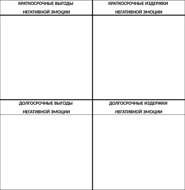 Также полезно выписать краткосрочные и долгосрочные выгоды (плюсы, преимущества, положительные последствия) и издержки (минусы, недостатки, отрицательные последствия) характерной для вас негативной эмоции, эмоций или стресса в целом (см. таб. 2 и Приложение 2).
