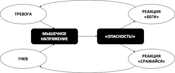 Частые, длительные, интенсивные эмоциональные переживания не могут не сказываться на нашем физическом самочувствии. Так, наиболее стрессовые эмоции – тревога и гнев, являющиеся следствием искажённых мыслей, проявляются в виде мышечного напряжения, которое, в свою очередь, сигнализирует мозгу об опасности и необходимости активации защитных реакций «беги» или «сражайся», обуславливающих усиление, соответственно, тревоги или гнева (см. рис. 4). Этот порочный круг возникает потому, что психика и тело неразрывно связаны между собой. Помимо этого, будучи «воспитанными» и «культурными» людьми, мы подавляем, а не выражаем свои эмоции, в силу чего возникающее мышечное напряжение не расходуется, а накапливается, что приводит к мышечным болям, зажимам, спазмам и симптомам. Тело обмануть невозможно, ведь оно неизменно будет реагировать на избыточные эмоциональные реакции, а если и попытаться его обхитрить, оно обязательно ответит напряжением и симптомами. Важно понимать, что наше тело узнаёт о стрессовых реакциях гораздо раньше, чем вы успеваете осознать, что находитесь во власти той же тревоги или гнева. В этой связи мышечное напряжение довольно часто является индикатором острых или хронических стрессов. Таким образом, если мы научимся замечать это мышечное напряжение и расслабляться на физиологическом уровне, то сможем значительно снизить уровень эмоционального стресса. Помните: вы не можете испытывать выраженной тревоги или сильного гнева, если ваше тело абсолютно расслаблено, ведь где избыточные эмоции – там телесное напряжение, а где телесное напряжение – там избыточные эмоции. Поэтому если вы регулярно и последовательно занимаетесь мышечной релаксацией, автоматически понижающей уровень избыточных негативных эмоций, то в меньшей степени подвержены влиянию стрессовых факторов и гораздо чаще пребываете в спокойном состоянии.