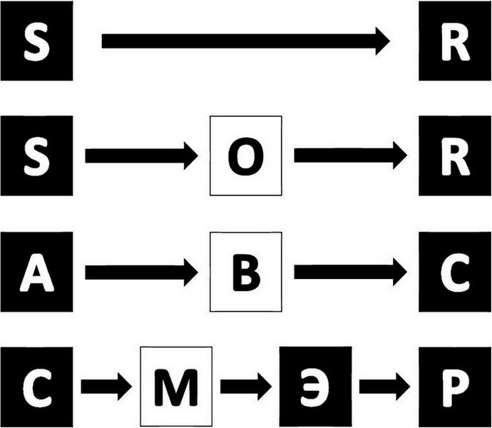 Ключевая переменнаяТаким образом, ключевой переменной, под углом зрения основателей, представителей и последователей когнитивно-поведенческой психотерапии, является мышление, обусловливающее эмоциональные, телесные и поведенческие реакции человека. Иными словами, реакции возникают не из-за непосредственного воздействия стимула, как считалось раньше (S → R). Между стимулом и реакциями важную роль играет организм (S → O → R), а именно отношение человека к тому или иному активирующему событию (A – activating event) в виде его мыслей и убеждений (B – beliefs), создающих эмоциональные, телесные и поведенческие последствия (С – consequences). В русскоязычном пространстве формула A-B-C[2] описывается с помощью аббревиатуры СМЭР, расшифровывающейся следующим образом: событие – мысли – эмоции – реакции (телесные и поведенческие)[3] (рис. 1).