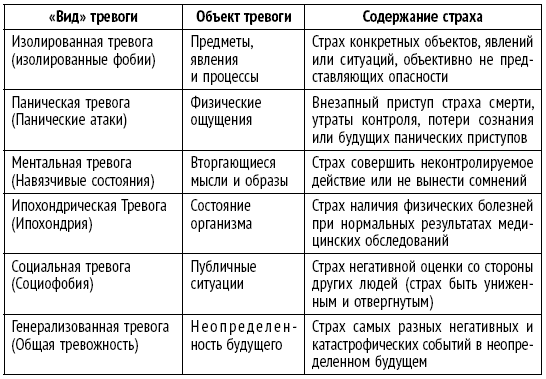 Избыточная тревога может выражаться в разных формах – в виде страхов конкретных предметов и явлений, собственных физических ощущений и симптомов, нежелательных мыслей и побуждений, наличия скрытых соматических или психических заболеваний, критики и осуждения со стороны других людей, а также негативных событий в непредсказуемом и неконтролируемом будущем. Говоря иначе, избыточная тревога может проявляться в форме самых разных тревожных расстройств, в связи с чем тревогу очень условно разделяют на изолированную (тогда речь идет о конкретных фобиях), паническую (здесь мы имеем дело с паническими атаками), ментальную (такая тревога имеет место при навязчивых состояниях), ипохондрическую (связанную с беспокойством по поводу собственного здоровья), социальную (вызываемую страхом негативной оценки окружающих[2]), а также генерализованную (беспокойство по разным поводам) (табл. 1).