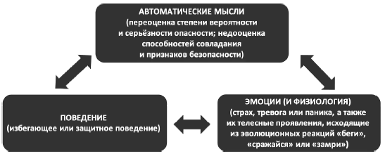Говоря предельно общо, активация одного «угла» треугольника тревоги приводит к усилению двух остальных: тревожные мысли ведут к тревоге и защитному/избегающему поведению; тревога (и ее телесные симптомы) способствует усилению тревожного поведения и мышления; наконец, тревожное (защитное/избегающее) поведение подпитывает тревожные мысли и эмоции. Таким образом, мысли, эмоции, телесные реакции и поведение тесно связаны между собой и образуют единую систему.