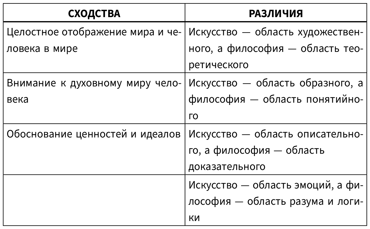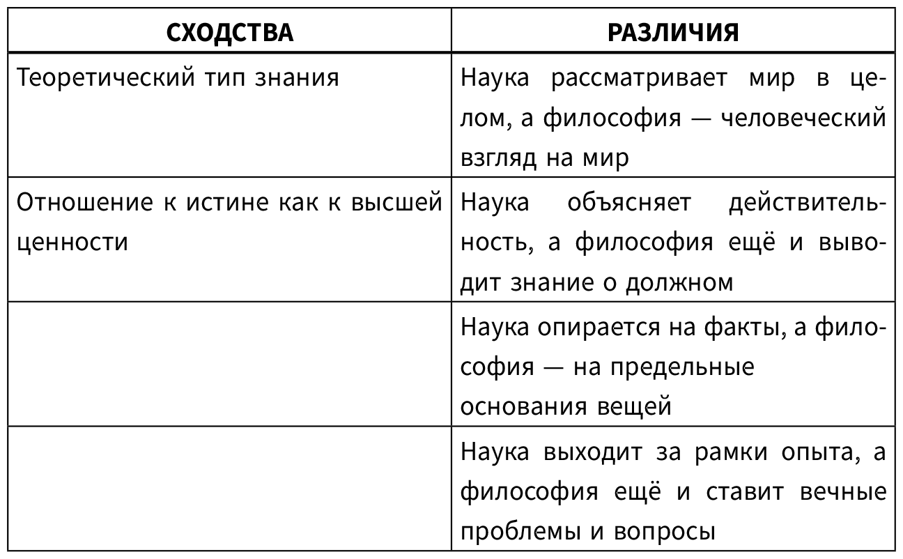 Чтобы понять сущность философии, необходимо сравнить её с другими формами культуры, такими как наука (табл. 7), религия (табл. 8) и искусство (табл. 9).