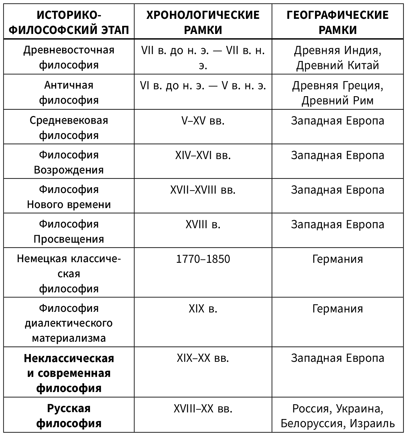 Основные историко-философские периоды развития философии с указанием их хронологических и географических рамок представлены в нижеследующей таблице (табл. 10).