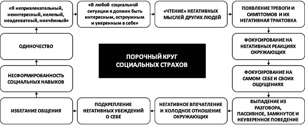 Вы можете быть убеждены в том, что вы непривлекательный, неинтересный, нелепый, неадекватный, никчемный, иными словами, иметь укоренившееся глубинное негативное представление о самом себе – негативную я-концепцию. Не желая сталкиваться с этим глубинным неосознаваемым негативным образом самого себя, вы требуете от себя идеального общения и полагаете, что в любой социальной ситуации должны говорить, действовать и выглядеть уверенно и превосходно. Но чем сильнее вы требуете от себя коммуникативного совершенства, тем чаще думаете о том, что любое, даже малейшее отклонение от ваших собственных стандартов общения будет воспринято окружающими негативно, и они раскритикуют, осудят и отвергнут вас. Говоря иначе, из-за наличия требований к себе вы начинаете постоянно думать о том, что думают о вас другие люди и «читаете» только их негативные мысли о себе: вам кажется, что вы никому не нравитесь и что все считают вас никудышным собеседником, из-за чего испытываете сильную тревогу и ее физические проявления. Ощущая тревогу и симптомы, вы интерпретируете их как признак того, что не справляетесь с ситуацией общения, чувствуете себя еще менее уверенно и начинаете дополнительно переживать о том, что другие заметят и негативно оценят вашу нервозность и симптомы.