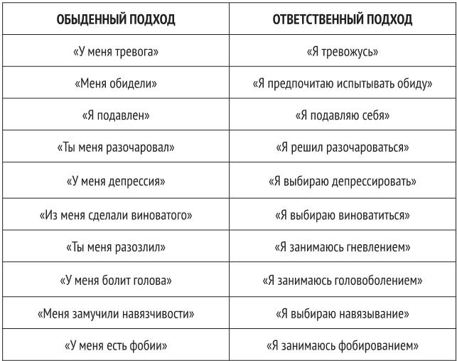 Ответственный подход к эмоциямВ свое время американский психиатр У. Глассер разработал терапию реальностью (на основе теории выбора), которая отвергает понятия тревоги и депрессии как существительных и определяет эмоции и поведение человека с помощью отглагольных форм. Такой подход акцентирует внимание человека на том, что он сам создает свои избыточные реакции, а не является их жертвой. Ниже приводятся высказывания, иллюстрирующие разницу между обыденным и ответственным подходами человека к своим эмоциям (табл. 1).