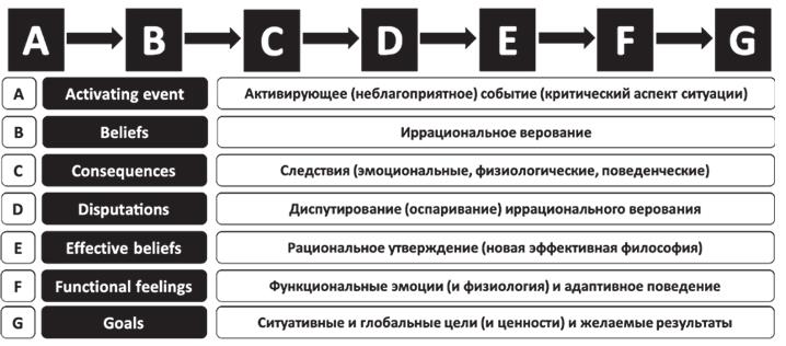 «Формула антинесчастья»Итак, А. Эллис, опираясь в том числе на работы различных философов, представил механизм формирования дисфункциональных реакций с помощью наглядной формулы А-В-С: активирующее событие (А) активирует иррациональное верование (В), которое приводит к эмоциональным, физиологическим и поведенческим следствиям (С). Эллис также подчеркивал, что формула А-В-С(activating event – beliefs – consequences), объясняющая способ восприятия человеком действительности и проясняющая источник его эмоциональных и поведенческих нарушений, проста для понимания, как азбука, и в этой связи доступна для освоения каждому человеку. Продолжение этой буквенной формулы отображает не менее понятные шаги для преодоления дисфункциональных реакций и улучшения качества жизни: D (disputations) – диспутирование (оспаривание) иррационального верования (которое приводит к дисфункциональным эмоциональным, телесным и поведенческим реакциям); E (effective beliefs) – рациональное утверждение (и – шире – новая эффективная философия), формулирующееся в результате оспаривания иррационального верования; F (functional feelings) – функциональные реакции (являющиеся следствием рационального утверждения); G (goals) – значимые для человека цели, ценности и желаемые результаты (достигающиеся на основе рационального утверждения и функциональных реакций) (рис. 3).