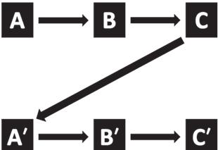Природа вторичных нарушенийОднако по поводу эмоций (С), являющихся следствием мыслей (В) о каком-либо событии (А), у людей нередко возникают вторичные мысли (В’), приводящие к вторичным эмоциям (С’). В этом случае вторичным событием (А’) выступает изначальная эмоция (С). Например, тревога (С), возникшая из-за катастрофических мыслей (В) во время полета на самолете (А), может трактоваться человеком как признак сумасшествия (В’), что приведет ко вторичной эмоции стыда или усилению изначальной тревоги (С’). В этом примере вторичным событием (А’) является изначальная эмоция тревоги (С). Естественно, что вторичные мысли (В’), приводящие к вторичным эмоциям (С’), могут возникать не только по поводу эмоциональных, но и по поводу телесных и поведенческих реакций (С = А’). Например, учащенное сердцебиение (С = А’), являющееся телесным проявлением тревоги, может интерпретироваться человеком как предвестник сердечного приступа (B’), что приведет к усилению тревоги и вызову бригады скорой помощи (С’). Или, скажем, повышение голоса на родную сестру (С = А’), выступающее поведенческим следствием гнева, может осмысливаться человеком как недопустимое и аморальное (B’), что вызовет вину, которая повлечет за собой извинения перед сестрой (С’) (рис. 4).
