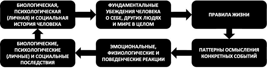 Биопсихосоциальная модель эмоциональных расстройствВне всякого сомнения, каждый человек осмысливает действительность по-своему, на что влияют и биологические, и психологические, и социальные факторы. В свою очередь, способ реагирования на те или иные события, осознанно или неосознанно выбираемый человеком и исходящий из его фундаментальных убеждений (о себе, других людях и мире в целом) и жизненных правил, ведёт к соответствующим эмоциональным, физиологическим и поведенческим реакциям, а далее – к психологическим, социальным и иногда даже биологическим последствиям (рис. 5). Таким образом, как отмечают К. Добсон и Д. Добсон, «люди в буквальном смысле создают свою реальность, а потом сами же на неё реагируют». Важно заметить, что эта идея высказывалась ещё немецким философом И. Кантом, полагавшим, что в процессе рассудочного познания любой человек во многом сам творит свой объект (познания). Более того, как пишет Дж. Оверхолзер, «как только человек создаёт свою интерпретацию реальности», она «начинает оказывать сильное влияние на его эмоции и поведение».