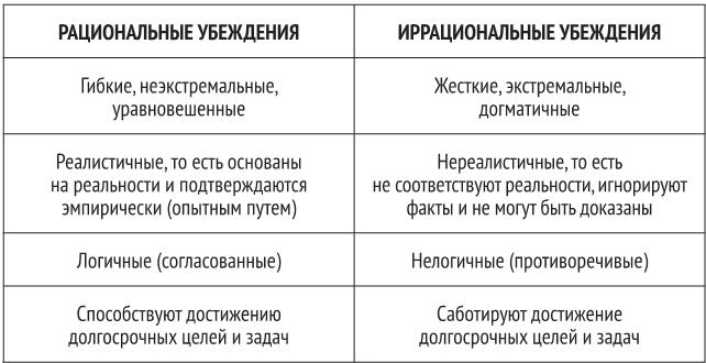 Рациональные и иррациональные убежденияРациональное мышление – это мышление, которое позволяет человеку реализовывать две главные ценности жизни – выживание и получение удовольствия, а также достигать значимых для него целей, способствующих увеличению счастья и уменьшению несчастья (причем как личного, так и общественного). Как замечают А. Эллис и К. Макларен, «быть рациональным – значит, эффективно достигать личных и групповых целей, однако эффективность и рационализм не одно и то же, поскольку кто-то может столь же эффективно действовать неразумно как по отношению к себе, так и к группе в целом» (Эллис, Макларен, 2008). Итак, если рациональные убеждения приводят к здоровым (уместным, оправданным) эмоциям и адаптивному поведению, то иррациональные убеждения способствуют возникновению нездоровых (избыточных, невротических) эмоций и проблемному поведению. Однако, как замечает Е. А. Ромек, «люди верят, часто искренне, что их иррациональные убеждения реалистичны, и они обязательно получат то, что хотят, тогда как в некоторых существенных отношениях их идеи нереалистичны („Моя дочь не должна лгать мне!!!“, но в реальности она – иногда, по крайней мере, лжет, так же как любой другой человек на планете Земля)». Специфические характеристики рациональных и иррациональных убеждений (с точки зрения РЭПТ) обобщены в табл. 2.