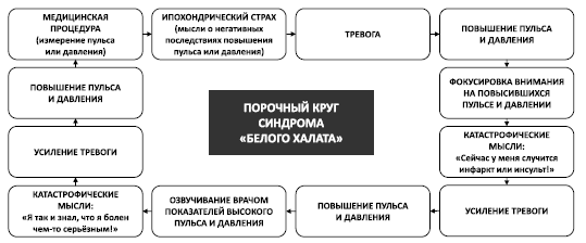 Что уж говорить об известном многим людям с ипохондрией синдроме «белого халата», который, как и в случае с порочным кругом ятрогенной гипералгезии, может срабатывать как самосбывающееся пророчество, как показано на расположенной ниже схеме (рис. 12).