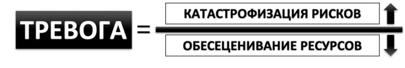 Таким образом, во время эпизодов тревоги человек избыточно концентрируется на мыслях об опасности и своей неспособности справиться с тревожащей ситуацией, что приводит к невозможности более трезвого рассмотрения менее угрожающих вариантов развития событий, поскольку в моменты выраженной тревоги довольно сложно мыслить рационально. Иными словами, человек начинает тревожиться, когда риски трактуются как высокие, а он не осознаёт, за счёт чего и как можно с ними совладать (см. рис. 12).