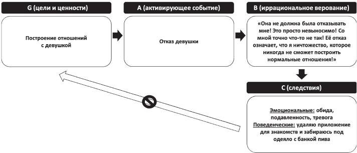 Природа нездоровых негативных эмоцийЕсли здоровые негативные эмоции (F), возникающие при наступлении неблагоприятных обстоятельств (А) и вызывающиеся рациональными утверждениями (E), способствуют достижению целей и реализации ценностей (G), то нездоровые негативные эмоции (С), проявляющиеся в нежелательных ситуациях (А) и создающиеся иррациональными верованиями (В), препятствуют осуществлению тех же целей и ценностей (G). К нездоровым негативным эмоциям относятся тревога, гнев, обида, подавленность, вина, стыд, дисфункциональная ревность и дисфункциональная зависть. Эти эмоции обусловливаются иррациональными верованиями, возникающими в конкретных ситуациях и отражающими дисфункциональные установки долженствования, катастрофизации, низкой переносимости фрустрации и глобальной оценки (обесценивания) (себя, других и/или мира). Иными словами, при появлении неблагоприятных и нежелательных событий (А), которые блокируют реализацию важных для человека целей и ценностей (G), он может требовать, долженствовать, настаивать (В) на отсутствии этих препятствий и тем самым создавать у себя нездоровые негативные эмоции (С), ведущие к проблемному поведению (С), что лишь помешает ему реализовать эти цели и ценности (G).