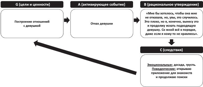 Иными словами, при возникновении неблагоприятного события человек автоматически делает выбор в пользу иррационального верования, которое «затмевает» рациональные позиции, что и приводит к быстрому превращению здоровых и адекватных негативных эмоций в нездоровые и неадекватные. Как замечают А. Эллис и Р. Тафрейт, «если ваши рациональные убеждения сильнее иррациональных и перевешивают их, то обычно вы не очень расстраиваетесь… в момент С, а если иррациональные убеждения сильнее, то в момент С вы очень расстроены» (Эллис, Тафрейт, 2021). Так, если человек хочет, чтобы его принимали окружающие, но не настаивает на этом, то будет испытывать здоровые негативные эмоции (например, волнение и досаду), если желаемого принятия со стороны других людей не происходит. При этом здоровые негативные эмоции мотивируют человека к совершению тех или иных действий, направленных на попытки улучшить взаимоотношения с другими. Однако если человек не просто хочет, а требует, чтобы другие люди его принимали, то как ему не тревожиться и не обижаться, когда другие не дают ему то, что «должны»? В таком случае поведение человека станет неадаптивным: например, он будет пытаться всем угодить или вести себя агрессивно.