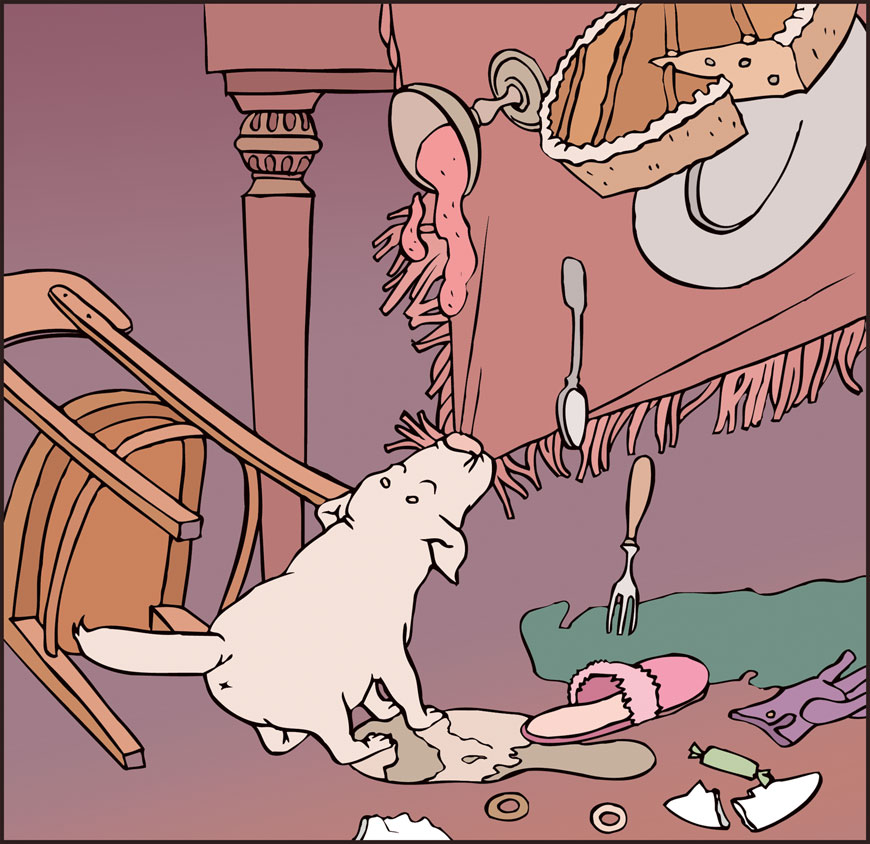 Кошка нахально восседала на прилавке и вылизывала то место, которое в приличном обществе не выставляют на всеобщее обозрение. Страшно представить, что бы было, если бы Казя залез на стол или даже на стул! А тут на тебе – полная анархия. Казя так разволновался, что начал гавкать – сначала тихо, а потом все громче.