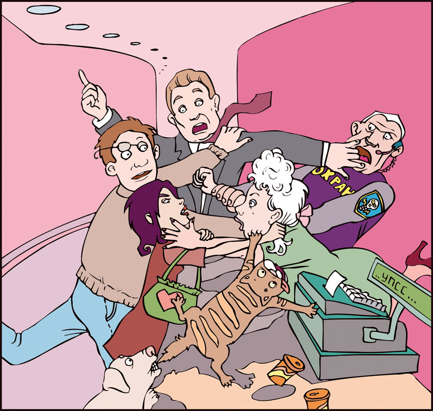 Оскорбления своих любимых хозяев Казя вынести не мог и смело ринулся в бой. Начался кавардак, что-то упало. Казя лаял и рвался с поводка, кошка шипела и отмахивалась когтистыми лапами. В схватку оказались вовлечены дополнительные силы: на стороне Кази бились охранник и подоспевшие Папа с Машей, а на противоборствующей стороне – кассирша, опекавшая кошку, и покупательница, стоявшая у кассы и оказавшаяся заядлой кошатницей. При наличии численного превосходства в Казином войске можно было с сожалением констатировать, что Папа с охранником не стоили и четверти кошатницы, а силы Маши и кассирши были примерно равны.