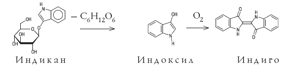 Самыми труднодоступными в течение многих тысячелетий были пигменты синего цвета. Вероятно, первое использование синей природной краски произошло примерно 5 тысяч лет назад. Во время раскопок шумерского города Ура Халдейского были найдены золотые и серебряные фигурки животных, украшенные ляпис-лазурью – полудрагоценным камнем, содержащим пигмент ультрамарин. Сравнительно недавно было показано, что синий цвет этого пигмента связан с присутствием в нем анион-радикала [·S3]–, в котором имеется неспаренный электрон (он изображен точкой). В Европе синие пигменты были настолько дорогими (их продавали буквально на вес золота), что порой специальные комиссии решали, какие именно участки росписи должны быть синего цвета. В античные времена использовали пигмент египетский синий, это был алюмосиликат меди (медное стекло). С VI–VII веков художники начали использовать природный ультрамарин, который готовили из ляпис-лазури, привозимой из Афганистана. По составу ляпис-лазурь – сложная смесь нескольких минералов, синий цвет которой придает гаюин – алюмосиликат, содержащий хлор и серу. Из килограмма лазури получали после длительной обработки всего 30 г синего пигмента. И лишь в 1704 г. был получен первый искусственный синий пигмент. Это была берлинская лазурь – гексацианоферрат железа-калия, содержащий атомы железа в разных степенях окисления: KFe+3[Fe+2(CN)6]. Синий кобальтовый пигмент – Тенарову синь (алюминат кобальта CoAl2O4) впервые получили во Франции в 1802 г., и был он в те времена очень дорогим. Однако известные к началу XIX века искусственные синие пигменты по своим качествам не могли заменить природную лазурь. В 1824 г. во Франции была обещана огромная премия в 6000 франков за способ получения искусственной лазури. Уже через четыре года премию получил Ж. Гиме; почти одновременно и независимо от него то же открытие сделал известный немецкий химик Л. Гмелин. Для получения искусственного ультрамарина прокаливали белую глину (каолин) с сульфатом калия и с углем. С тех пор природный камень перестали переводить на краску. Органический синий пигмент – индиго начали добывать еще несколько тысячелетий назад в Индии. Индиго добывали из листьев различных растений. Наибольший выход получался из растения рода Indigofera, которое произрастает в странах с тропическим влажным климатом. В Европе до середины XVII века, когда голландцы начали ввозить индиго из южных колоний, этот краситель добывали из листьев местного растения – так называемой красильной вайды. Листья замачивали водой, при этом в раствор переходил бесцветный гликозид (соединение с глюкозой) индикан. Затем водный экстракт сбраживался под действием микроорганизмов. В результате ферментативного процесса образуется глюкоза и 3-гидроксииндол (индоксил) – бесцветное соединение, которое при окислении кислородом воздуха (быстрее на прямом солнечном свету) превращается в индиго, оседающее на дно сосуда в виде синих хлопьев. Вся цепочка превращений показана на схеме.