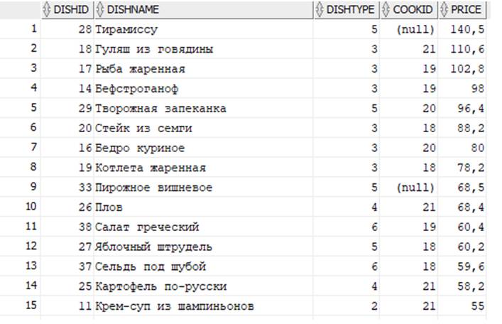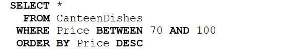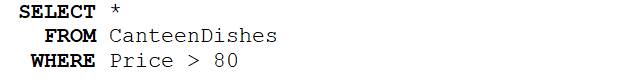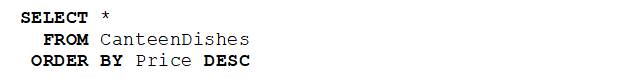 Это еще одна очень важная тема! Ее знание не просто так спрашивают на собеседованиях! Выберем из таблицы CanteenDishes («Блюда столовой») строчки. Для повторения темы сортировки, заодно, упорядочим выбираемые блюда по цене в обратном порядке: