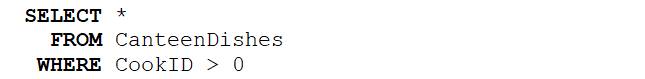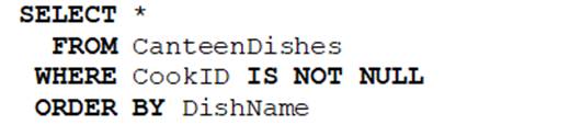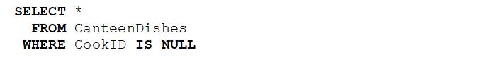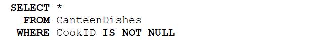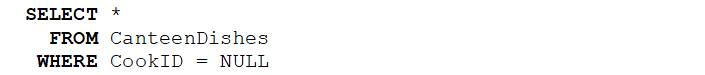 Чтобы выбрать блюда столовой с проверкой на NULL в столбце CookID, необходимо использовать оператор IS или IS NOT. Корректируем предыдущий пример: