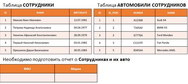 В таблице «Автомобили сотрудников» столбец «ID» – это всего лишь сквозной идентификатор, первичный ключ (номер машины по-порядку). Он нас сейчас не интересует. А вот столбец «ID_PERS» – это внешний ключ, ссылающийся на таблицу «Сотрудники». Он нам сейчас будет нужен. Другими словами, в графе «ID_PERS» указан идентификатор сотрудника, которому принадлежит автомобиль. Согласно нему видно, что BMW X3 и Ford Mondeo принадлежат Петровой Надежде Анатольевне. А у Первого Николая Николаевича, сотрудника с идентификатором 4, нет ни одного автомобиля.
