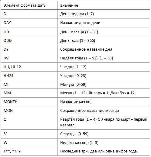 В таблице ниже список основных элементов даты (и времени), которые можно использовать при составлении формата для функции to_char.