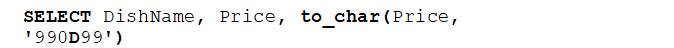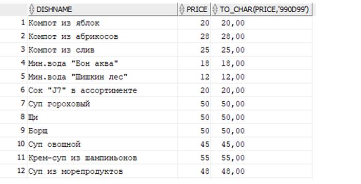 Самое первое на что нужно обратить внимание в маске, это на разделитель целой и дробной части – D (англ. delimiter – разделитель). Далее слева и справа от разделителя мы видим цифры «0» и «9». «0» обозначает обязательное число. То есть в ценах блюд столовой до запятой должно быть минимум одно число. Даже если это будет 0. Например, цена 0 рублей 50 копеек. «9» обозначает необязательное число. В нашей маске после разделителя указаны два необязательных числа. При стоимости товара в ровно 20 рублей, после запятой нет чисел. Они бы были если товар стоил 20 рублей 55 копеек, но мы, исходя из того, какие цены у нас есть в столовой, заложили в формат, что после разделителя целой и дробной части, дальше чисел может не быть (в случае целых чисел). И поставили «9» и «9», показывая Ораклу, что нам нужны здесь два знака, но их в значении цены может не быть. Благодаря этому Оракл вывел цену в третьем столбце со знаками после запятой, даже, в случае целых чисел.