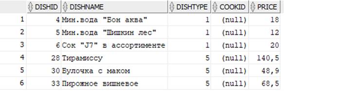 Представим, что перед нами стоит задача вывести все блюда, которые не готовятся в нашей столовой, то есть те, где не указан повар (CookID). Например, пирожное Тирамиссу повара нашей платной столовой сами не готовят. Оно закупное из продовольственной базы. Или, например, питьевая минеральная вода (не попала на скриншоте выше, не уместилась, так как отображены не все строчки). Ее также привозят в больших объемах в маленьких бутылочках и продают в столовой.