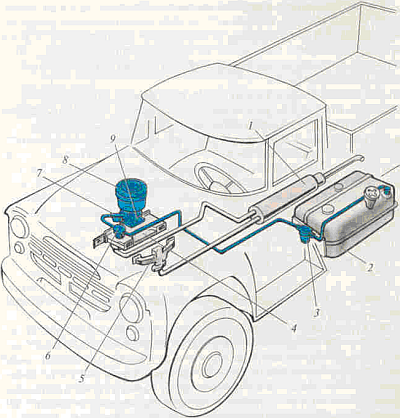Топливо помещается в топливном баке, который расположен сбоку автомобиля на раме или под сиденьем водителя. При работе двигателя топливо из топливного бака 2, через фильтр – отстойник 3, подается бензиновым насосом 6 к карбюратору 9. Одновременно в карбюратор поступает воздух через воздушный фильтр 8, который смешивается с мелкораспыленными частицами бензина, образуя горючую смесь. Горючая смесь через впускной коллектор поступает в цилиндры двигателя и, смешиваясь с остаточными газами, образует рабочую смесь. Рабочая смесь воспламеняется при помощи электрической искры и сгорает. Отработавшие газы после сгорания отводятся через выпускной трубопровод (коллектор), и далее через глушитель 6 в атмосферу.