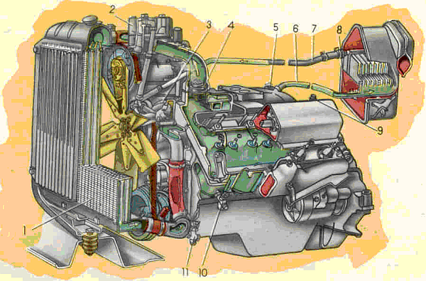 Рис. Схема системы охлаждения двигателя типа ЗИЛ. 1 – радиатор, 2 – компрессор, 3 – водяной насос, 4 – термостат, 5 – кран отопителя, 6 – подводящая трубка, 7 – отводящая трубка, 8 – радиатор отопителя, 9 – датчик указателя температуры воды в системе охлаждения двигателя, 10 – сливной кран рубашки блока цилиндров (в положении «открыто»), 11 – сливной краник радиатора.