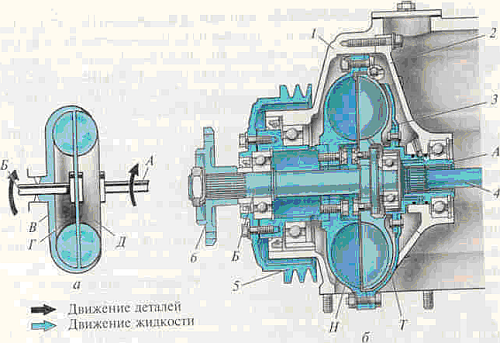 Рис. Гидромуфта, а – принцип действия; б – устройство, 1 – крышка блока цилиндров, 2 – корпус, 3 – кожух, 4 – валик привода, 5 – шкив, 6 – ступица вентилятора, А – ведущий вал, Б – ведомый вал, В – кожух, Г, Д – сосуды, Т – турбинное колесо, Н – насосное колесо.