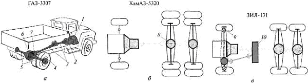 Схемы трансмиссий, а – с двумя ведущими колесами (4х2), б – с четырьмя ведущими колесам (6х4), в – с шестью ведущими колесами (6х6), 1 – сцепление, 2 – коробка передач, 3 – карданная передача, 4 – ведущее колесо, 5 – полуоси ведущих колес, 6 – дифференциал, 7 – главная передача, 8 – промежуточный средний ведущий мост, 9 – карданный шарнир равных угловых скоростей, 10 – раздаточная коробка.