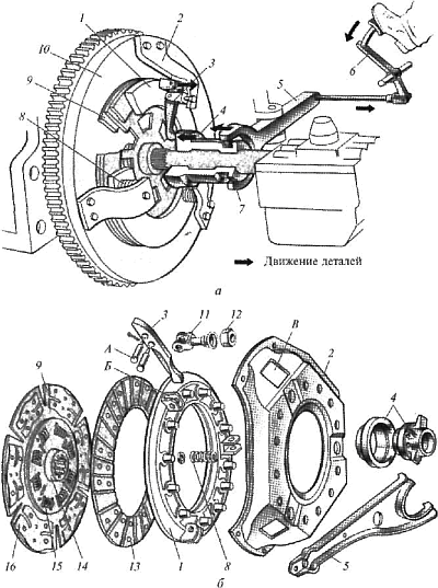 Сцепление. а – принципиальная схема, б – детали, 1 – ведущий диск, 2 – кожух, 3 – отжимной рычажок, 4 – выжимной подшипник, 5 – вилка включения сцепления, 6 – педаль, 7 – ведущий вал коробки передач, 8 – нажимная пружина, 9 – ведомый диск, 10 – маховик, 11 – вилка отжимного рычажка, 12 – регулировочная гайка, 13 – фрикционная накладка ведомого диска, 14 – ступица ведомого диска, 15 – пружина демпфера, 16 – пластина демпфера, А – палец, Б – прилив, В – окно кожуха.