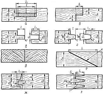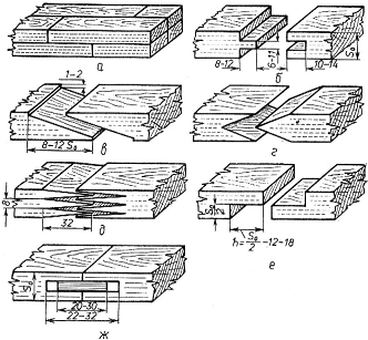 а – впритык, б – в паз и гребень, в – на ус, г, д – клиновидное, е – в четверть, ж – на рейку