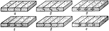 а – на гладкую фугу, б – в четверть, в – на рейку, г – в паз и гребень, д – в паз и треугольный гребень, е – «ласточкин хвост»