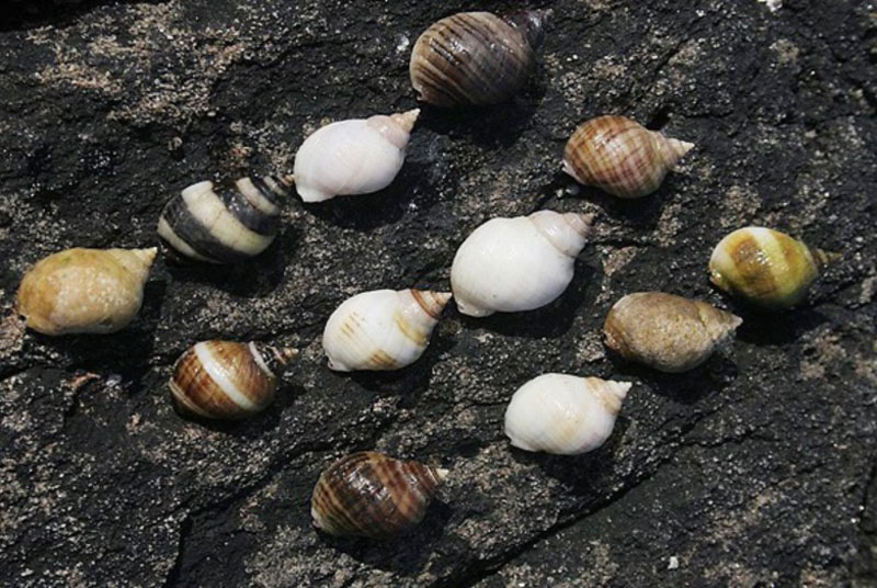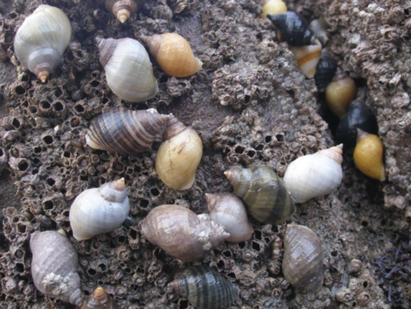 Рисунок 6. Разнообразие окраски раковин Nucella lapillus в пределах одного и того же местообитания.[7]