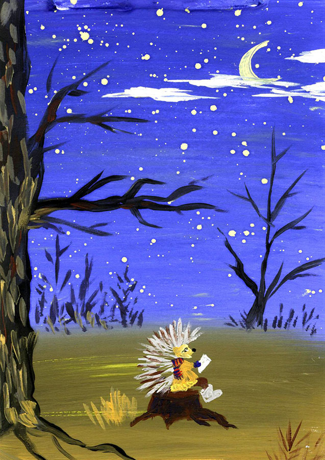 В тот вечер огромное чёрное небо подмигивало ему большими и яркими, как мамины бусины, звёздами. Ёжик сидел на пеньке под старым дубом и слушал, как от мороза трещат деревья.