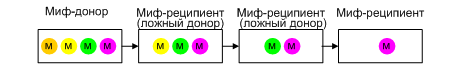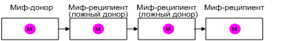 Донор не всегда выступает подлинным «родителем» мифологемы. Иногда он также в свою очередь является реципиентом, взявшим мифологему, как эстафетную палочку, от какого-либо вышестоящего донора. Такое заимствование может представлять собой цепочку передатчиков мифологем, где многие доноры являются реципиентами для их предшественников.