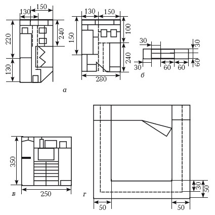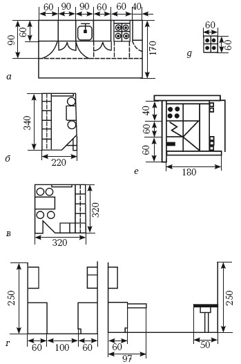 Рис. 4. Функционально-планировочная организация кухни: а) кухонная зона для семьи из 3 человек:; б) кухня для эпизодического приема пищи; в) угловое размещение оборудования; г) минимальные проходы; д) оборудование кухонь; е) кухня-ниша
