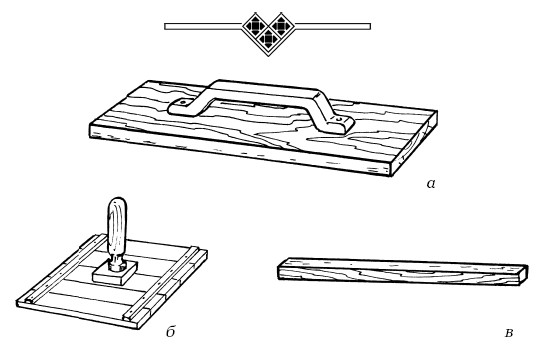 Сокол (рис. 16 б) нужен для переноса раствора к стене. Правилом (рис. 16 а) пользуются для выравнивания штукатурки по маякам, а полутерком (рис. 16 в) – для затирания поверхности.