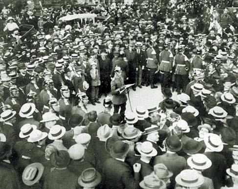 Офицер гренадерского полка на главной улице Берлина – Унтер-ден-Линден – зачитывает обращение кайзера Вильгельма II к германскому народу о том, что наступила угроза войны. Вторая половина дня 18 (31) июля 1914 г.
