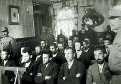 Суд над участниками сараевского убийства. На скамье подсудимых Гаврило Принцип сидит в самом центре первого ряда