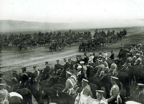 Русские артиллеристы проходят парадным строем перед президентом Франции Раймоном Пуанкаре в военном лагере в Красном Селе. 10 (23) июля 1914 года. С середины XIX века Красное Село было летней воинской столицей Российской империи. Здесь располагался гигантский военно-учебный комплекс общей площадью около 210 квадратных километров